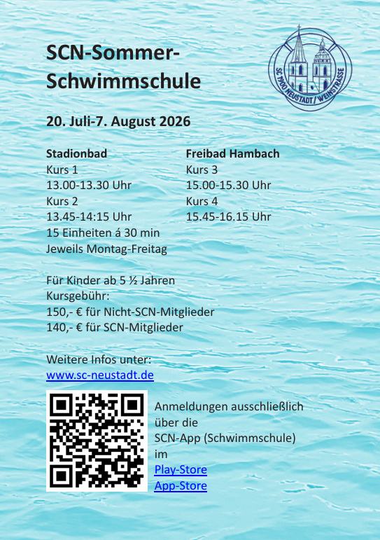 Die Schwimmkurse werden in Kooperation mit dem Schwimm Club Neustadt angeboten. Der Kurs findet im Zeitraum vom 20.07. - 7.08. statt.